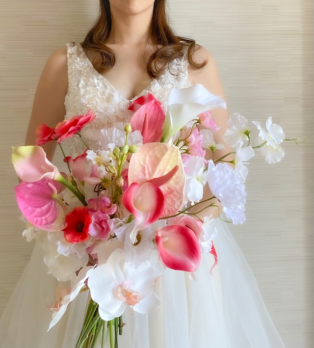 リゾートや前撮り、お色直しでお持ちいただくとインパクト大な華やかブーケです。 人気花材をふんだんに使用しています。 【商品内容】 お任せブートニア付きの完成品販売です。 リボンに関しまして➡︎ ブーケはもちろん、お召しになるドレスに合わせていただきたいため、事前にInstagramのDMへお問い合わせください。 リボン決定後、お仕立て出来次第、数日中に発送可能です。 【アーティフィシャルフラワーについて】 当店ではアーティフィシャルフラワー(高品質な造花)のみを使用してブーケをお作りしております。 製品の特性上、直射日光に長期間当たってしまうと日焼けして色が褪せてしまうことがございます。 陽当たりの良い場所は避けて保管くださいませ。 生花と同様に同じ種類のお花でもお花の開き方や形に若干の違いや個体差がございます。 お花の種類によって、お花が取れやすいことがございます。 万が一取れてしまった場合は、接着剤で修復可能でございますので一度ご相談くださいませ。